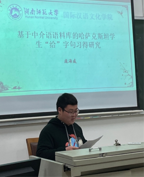 19级研究生庞海威汇报了论文《基于中介语语料库的哈萨克斯坦员工“给”字句习得研究》,在分析哈萨克斯坦员工“给”字句正误语料的基础上,考察哈萨克斯坦员工“给”字句的偏误类型与习得顺序。