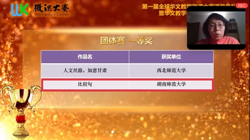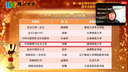 1月19日晚,由暨南大学、华侨大学、唐风国际教育集团联合主办的“第一届全球华文教学微课大赛”颁奖典礼在线上举行。此次比赛共有来自21个国家、500余位选手提交了近400件参赛作品。beats365教师精心制作的《比较句》系列微课,荣膺团体赛最高奖项一等奖,邓敏老师的《中国旗袍与东方之美》获个人赛国内组二等奖。曾丽娟老师作为团队负责人发表获奖感言。