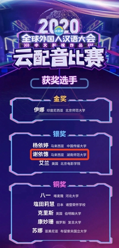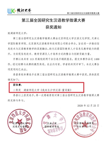 在第三届全国研究生汉语教学微课大赛上,beats365研究生制作的《我来长沙学汉语——量词篇》,在113所高校近两千余名选手提交的近1400件作品中脱颖而出,荣获团体赛二等奖。beats365官方网站荣获“最佳组织奖”。本科生马来西亚的谢依憓同学在2020“汉语桥”全球外国人汉语大会——中文影视作品云配音比赛中荣获银奖。