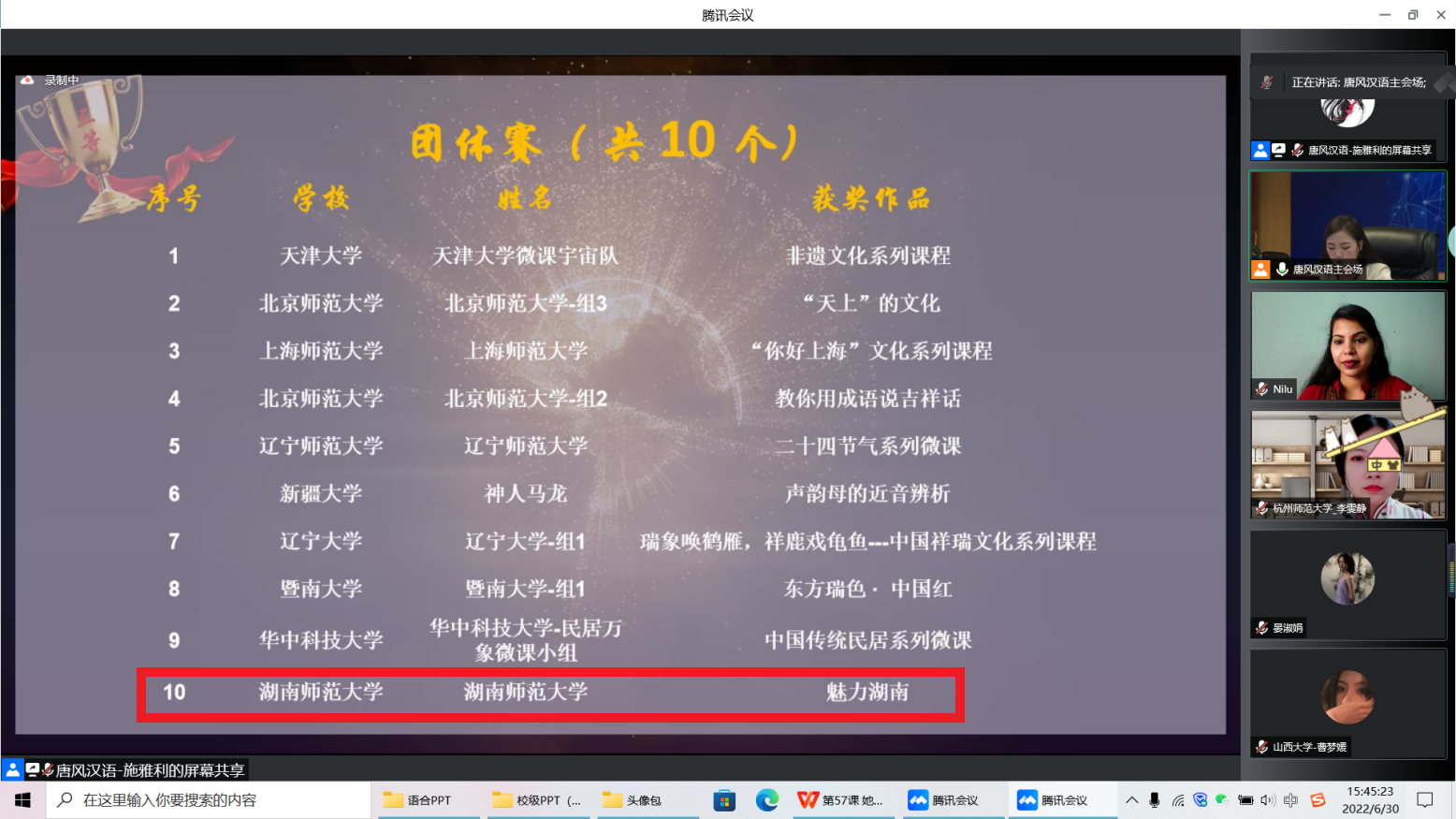 (通讯员 晏淑娟)近日,由北京师范大学国际中文教育公司、上海大学国际教育公司以及北京唐风汉语科技有限公司共同发起的“第四届全国研究生汉语教学微课大赛”落下帷幕。在beats365教师邓敏、周炯的指导下,公司2020级对外汉语专业13名研究生呈送的系列微课作品《魅力湖南》在文化类微课团体赛中荣获全国三等奖。
