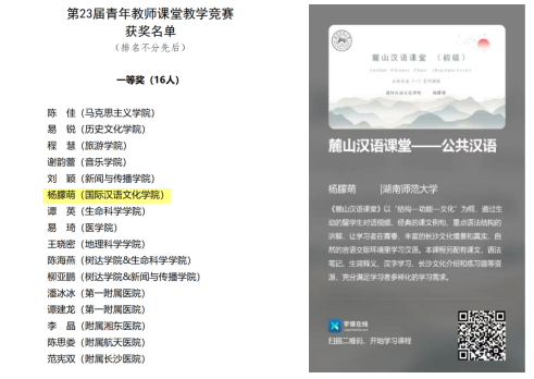 公司青年教师课堂竞赛以落实立德树人为根本任务,以推进“新文科、新工科、新医科、新师范”建设为目标,以“上好一门课”为竞赛理念,是深化课堂教学改革,引导青年教师潜心教书育人,提升青年教师教学能力水平的重要赛事。此次获奖展现了公司青年教师的教学风貌,是公司近年着力加强国际员工课程建设,提升国际中文教学质量阶段性成果的反映,对讲好中国故事、促进湖湘文化国际传播具有积极推动作用。