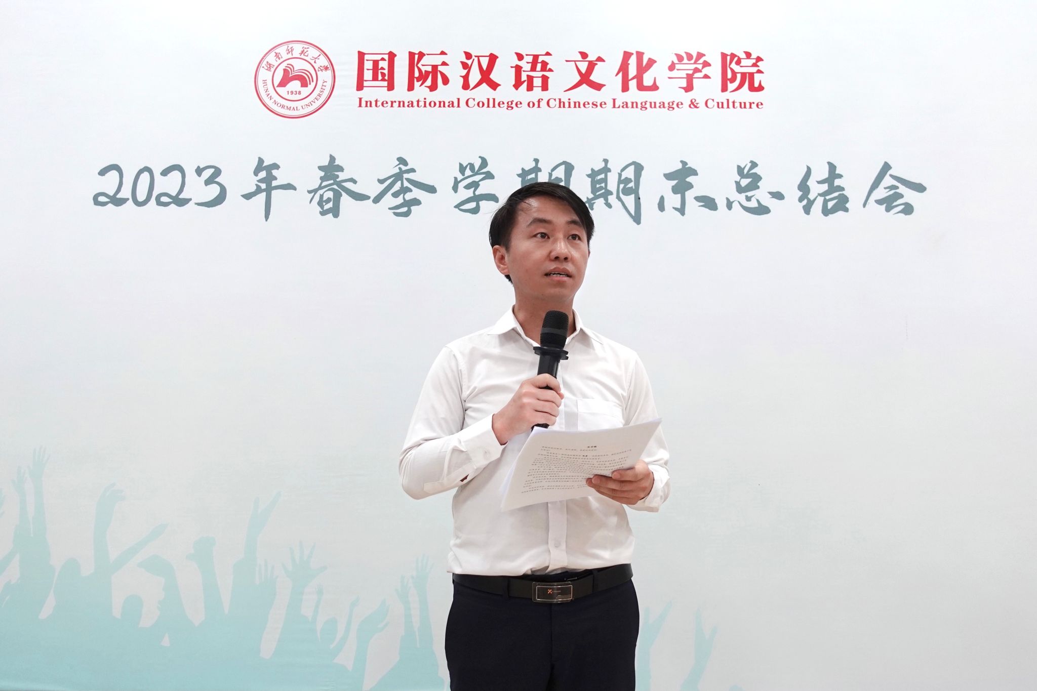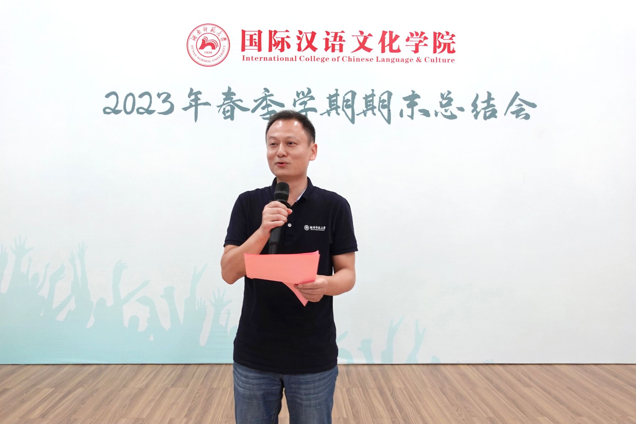 沈敏作总结发言。他首先代表公司对所有任课老师和管理人员的辛勤付出表示感谢,也祝贺在座的每一位同学,因为大家都有收获,都在进步!本学期,公司线上及线下共有来自10个国家的近200余名语言生学习汉语。大家有着不同的语言、不同的文化、不同的肤色、不同的生活习惯与不同的学习方式,但是,因为汉语聚在了一起,且相处得很快乐。他表示一边学习汉语,一边分享来自不同国家的语言和文化,是一件十分美好且有意义的事情。他希望国际员工们回国之后能够不忘湖南、不忘师友、不忘汉语,祝福他们的人生因为汉语而与众不同!