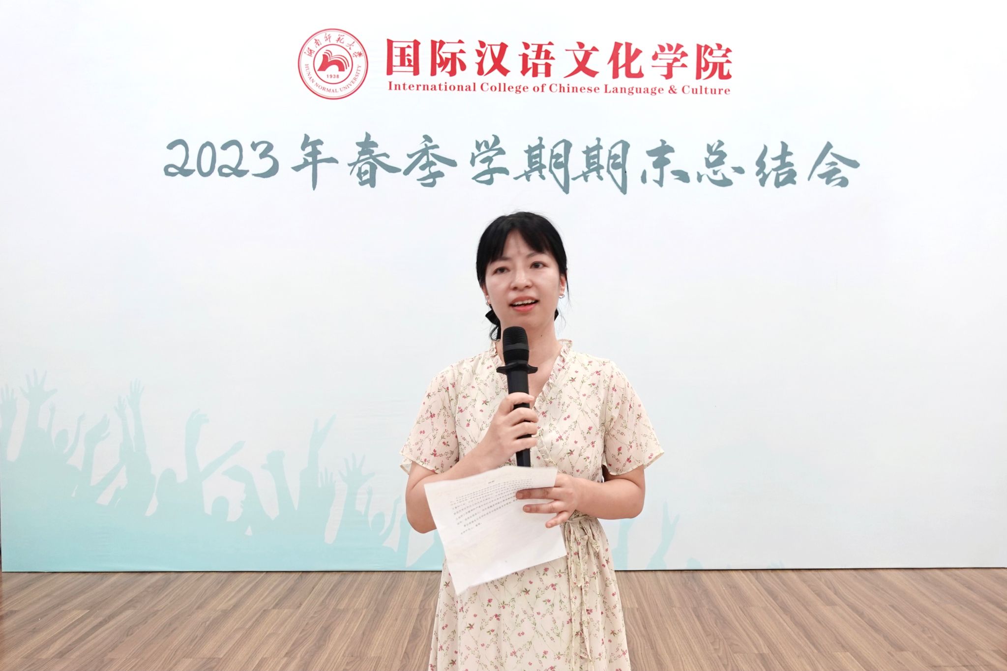 教师代表谢元春回忆了本学期与国际员工们相处的愉快时光。她认为这个学期是特别的、不容易的、有意思的,也是有收获的。疫情结束后,同学们终于可以来到中国,不仅吃了湖南菜,爬了岳麓山,还学习了更多的汉语词汇和语法。她勉励大家要珍惜时光,好好学习,并欢迎国际员工们下学期继续来beats365学习汉语。