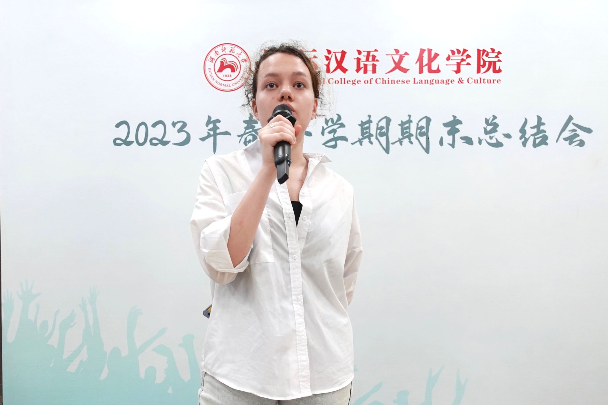 来自俄罗斯的语言生阿霞对老师和同学们的帮助表示衷心感谢,并表达了对中国、对长沙、对湖南师大的喜爱和不舍之情。她表示尽管语言学习结束后就要回国了,但她将不忘在湖南师大学习和生活的时光,以后一定会再回公司看看。