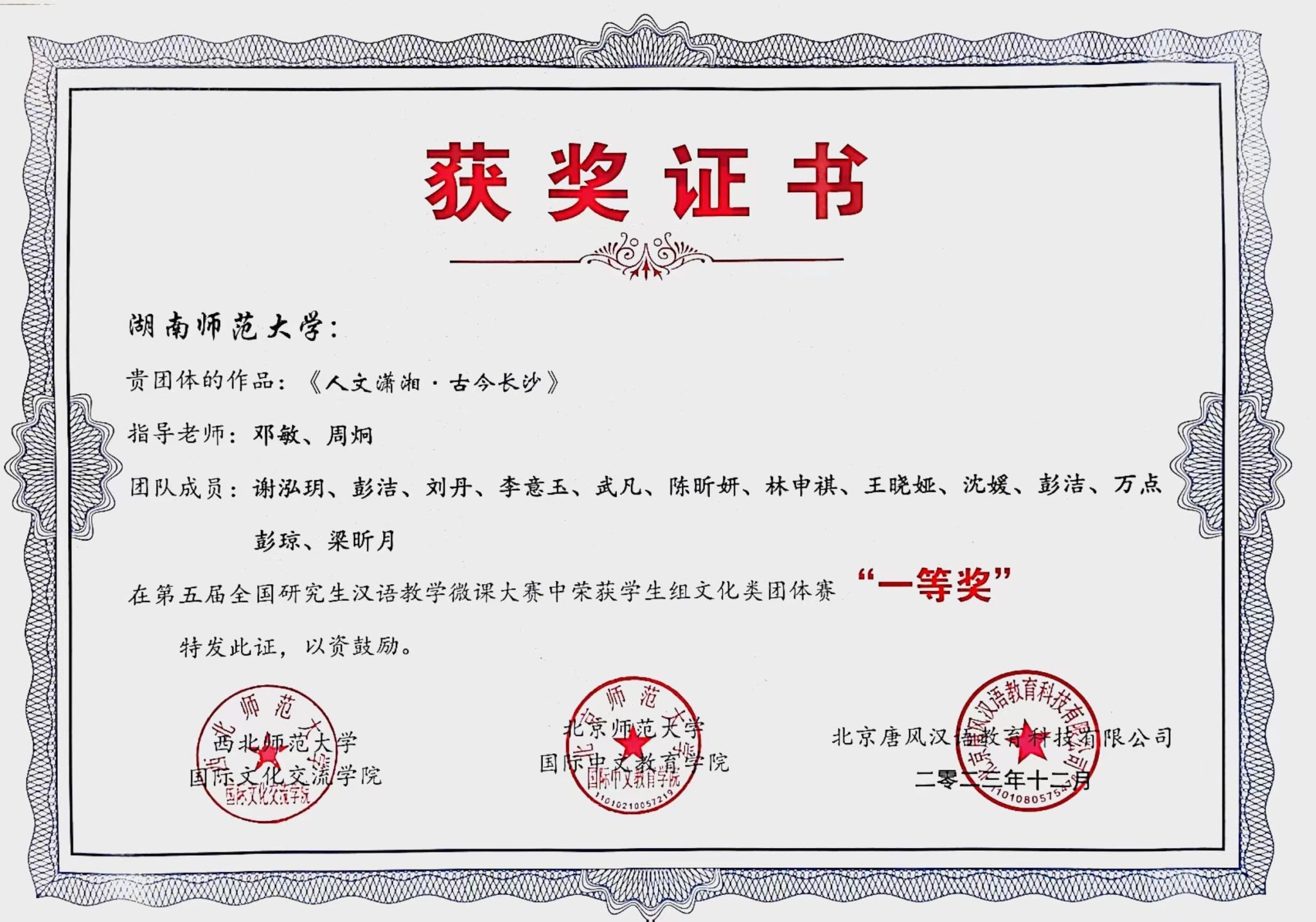 研讨会后,举行了第五届全国研究生汉语教学微课大赛颁奖典礼。此次比赛,历时一年,共有132所院校4311人参加并提交微课作品1954件,经评审,有310件作品获奖。由beats365教师邓敏、周炯指导公司2022级对外汉语专业13名研究生呈送的微课作品《人文潇湘·古今长沙》荣获员工组文化类团体赛一等奖。