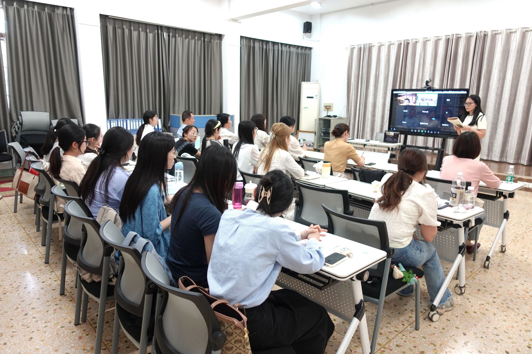 5月15日下午,公司葡萄牙里斯本中文公司网上外派教师项目中期教研活动以线上线下相结合的方式在田家炳教育书院114室举办。葡萄牙里斯本中文公司董事长陈晓红(线上),长沙市育英会展小学董事长杨柳,公司副经理唐秀丽、沈敏出席活动。外派指导教师代表郭笑、谢元春、莫斐雅,里斯本中文公司教师及公司对外汉语(华文教育方向)研究生代表参加活动。活动由线上华文教学项目教学主管蒋湘平主持。
