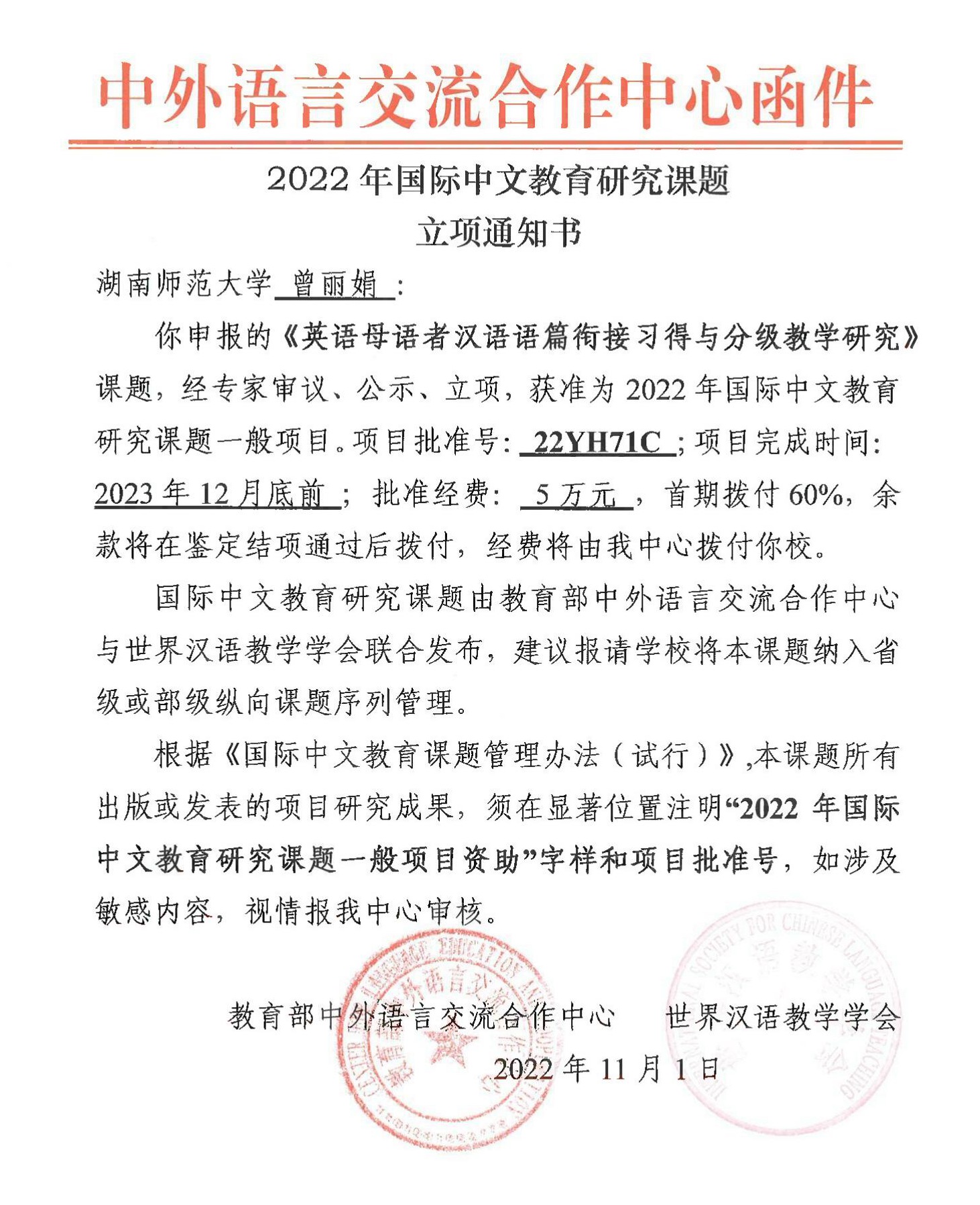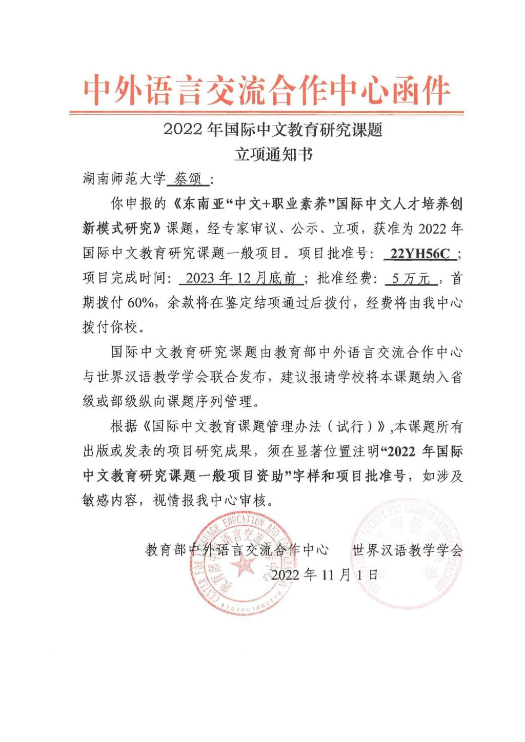 近日,教育部中外语言交流合作中心公布2022年国际中文教育研究课题立项名单,公司经理蔡颂教授主持申报的“东南亚‘中文+职业素养’国际中文人才培养创新模式研究”(22YH56C)、曾丽娟副教授主持申报的“英语母语者汉语语篇衔接习得与分级教学研究”(22YH71C)2个课题获批立项。