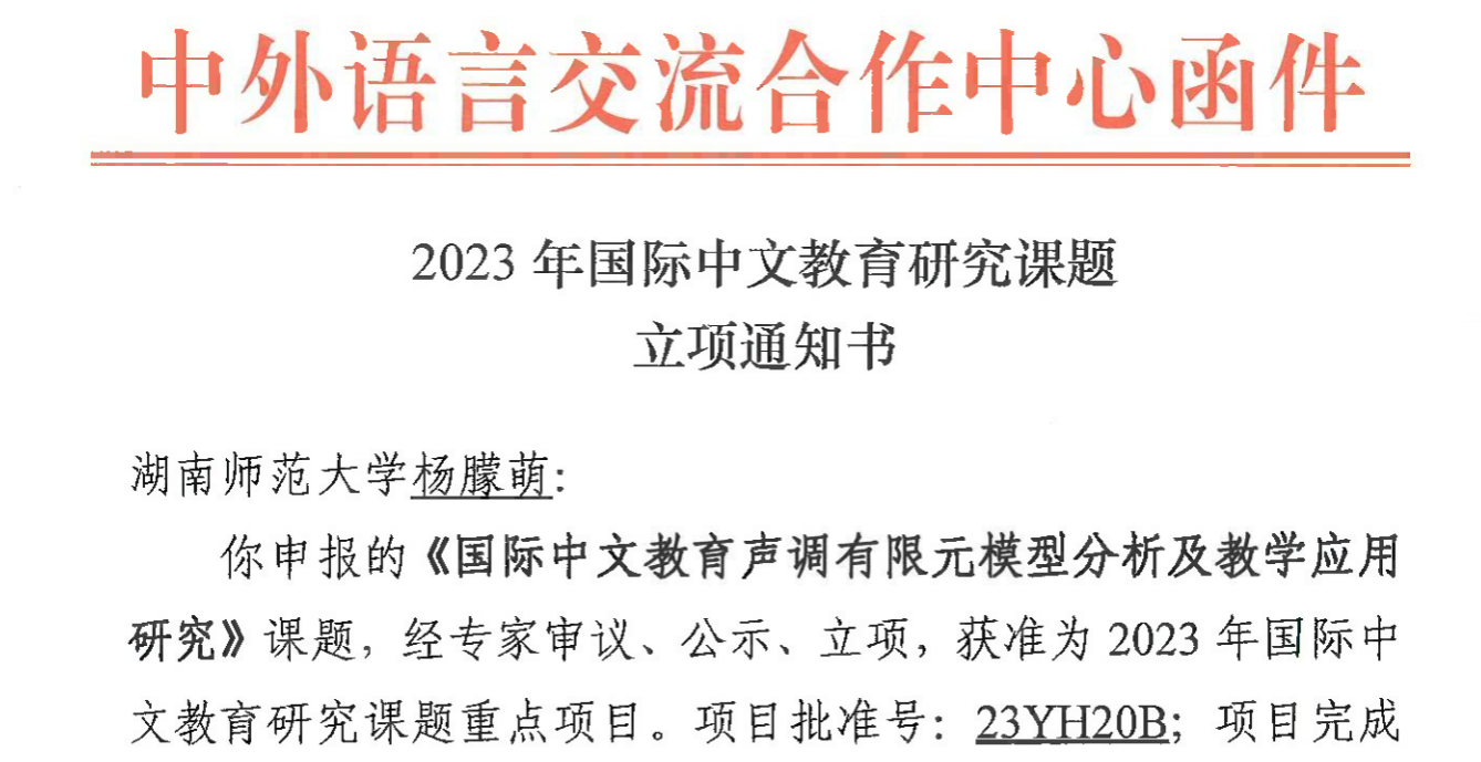 近日,教育部中外语言合作交流中心公布了2023年度国际中文教育项目立项名单。公司杨朦萌老师申报的《国际中文教育声调有限元模型分析及教学应用研究》(23YH20B)获2023年国际中文教育研究课题重点项目。这也是公司近年来获得的第二项教育部语合中心国际中文教育研究课题重点项目。