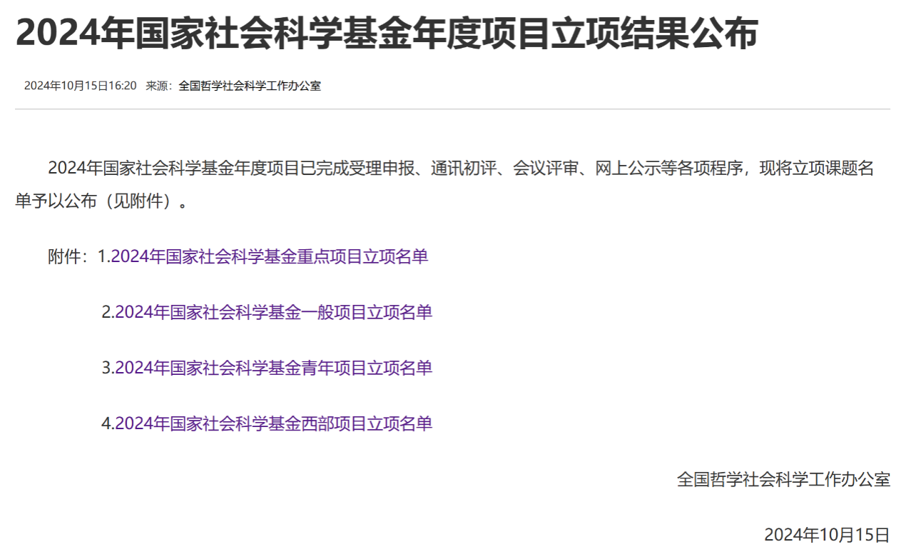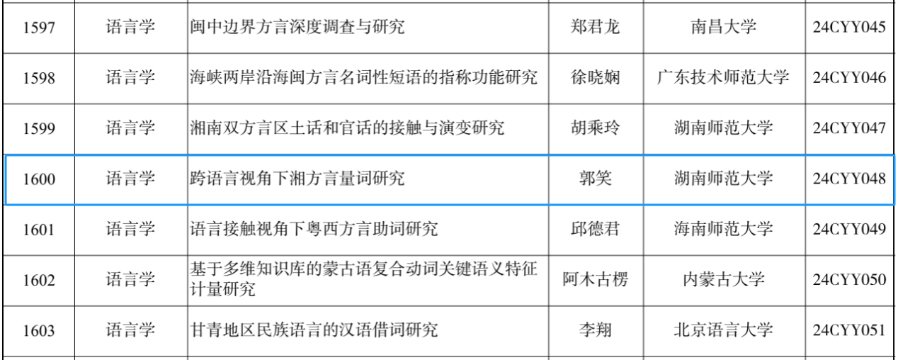 近日,全国哲学社会科学工作办公室发布了2024年度国家社会科学基金年度项目立项名单。公司郭笑副教授申报的《跨语言视角下湘方言量词研究》(24CYY048)获2024年国家社科基金青年项目。