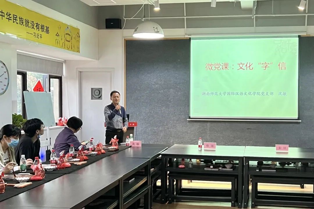 沈敏为党员师生带来了主题为“文化‘字’信”的微党课。他播放了习近平总书记参观河南安阳殷墟博物馆的新闻视频,并从汉字敬畏、汉字之美、汉字历史、汉字独特性、中外汉字文化网站建设情况等方面对汉字文化进行了讲解。他希望大家坚定文化自信,树立文字自信,做中华文化的忠实传承者和弘扬者。