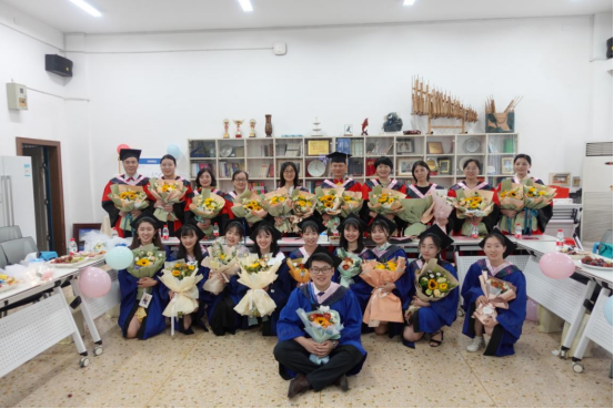 副经理唐秀丽为每位毕业生赠送了临别礼物,线上和线下的各位毕业生依次发言后,向老师们赠送鲜花并合影留念。