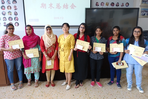 最后,唐秀丽副经理做总结发言。她首先代表公司恭喜所有获得优秀奖和全勤奖的同学们,也祝贺在座的每一位同学,因为每一位同学的汉语都有了很大的进步。这个学期一共有22个国家186名同学在国汉院学习。大家有着不同的肤色、不同的语言、不同的文化、不同的生活习惯。但是,大家在一起相处得很好。一边学汉语,一边分享来自不同国家的语言和文化是一件十分美好而有意义的事情。唐经理希望职工们回国之后能够不忘湖南、不忘师友、不忘汉语。希望他们的人生,因为汉语而与众不同。