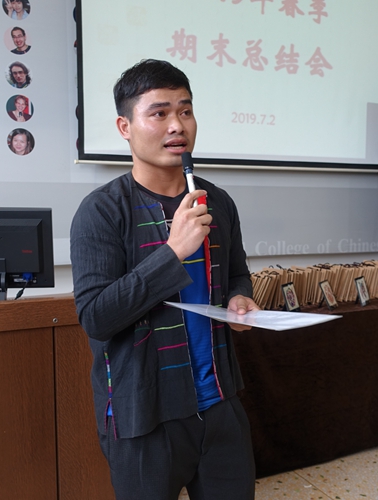来自老挝的苏欣也分享了自己留学期间的经历。他说自己与汉语结缘于一次孔子公司的学习,此后对汉语产生了极大的兴趣并来到湖南师大学习。这一年他参加了不少活动,永州的语言实践让他印象深刻。他学习了当地的武术,练习了有趣的女书,品尝了风味小吃,体验了当地的风俗习惯,并且作为职工代表发了言。他感谢公司给职工们提供了如此宝贵的机会。职工活丰富多彩,所有的经历都会成为他美好的回忆。未来他将继续在湖南师大