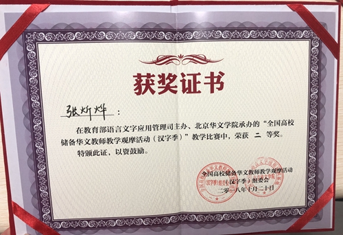 本次大赛邀请李晓琪、姜丽萍、朱志平、李嘉郁、童盛强等十几位国内华文教育、对外汉语教学领域知名专家担任评委。全国36所高校的40余位汉语国际教育、华文教育专业在读员工参加了此次活动。公司研究生张炘烨在中高级组以“神奇的火”为主题,贯彻认、读、用、写的教学原则,串讲了火字旁、火字底以及四点底的汉字,中间巧妙穿插中华文化的教学,获得专家评委的认可,荣获二等奖。