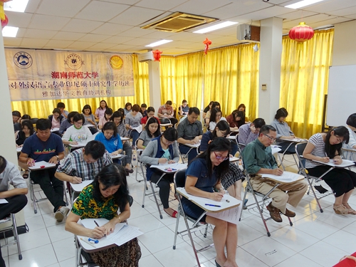 为提升印尼华文教师队伍的学历化、专业化水准,公司华文教育基地受国侨办委托,先后面向印尼培养本科层次的华文教师近200人。今年开始将以境外办学的形式面向印尼举办对外汉语专业(华文教育方向)硕士研究生学历教育。此次招生考试分设雅加达和山口洋两个考点,共有近70名印尼籍现职华文教师或管理人员报名参加,考试科目分为《高级汉语》和《中华文化及华文教学》。研究生院招办主任许广、国汉院华教干事田天与印尼雅加达华文教育协调机构严格组织考试,严明考场纪律,考试秩序井然,圆满顺利完成。