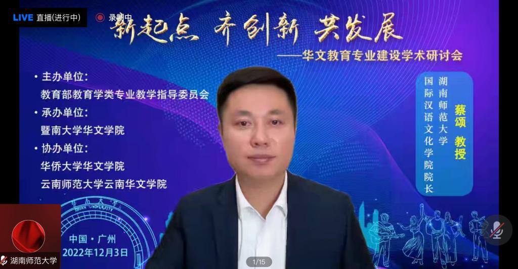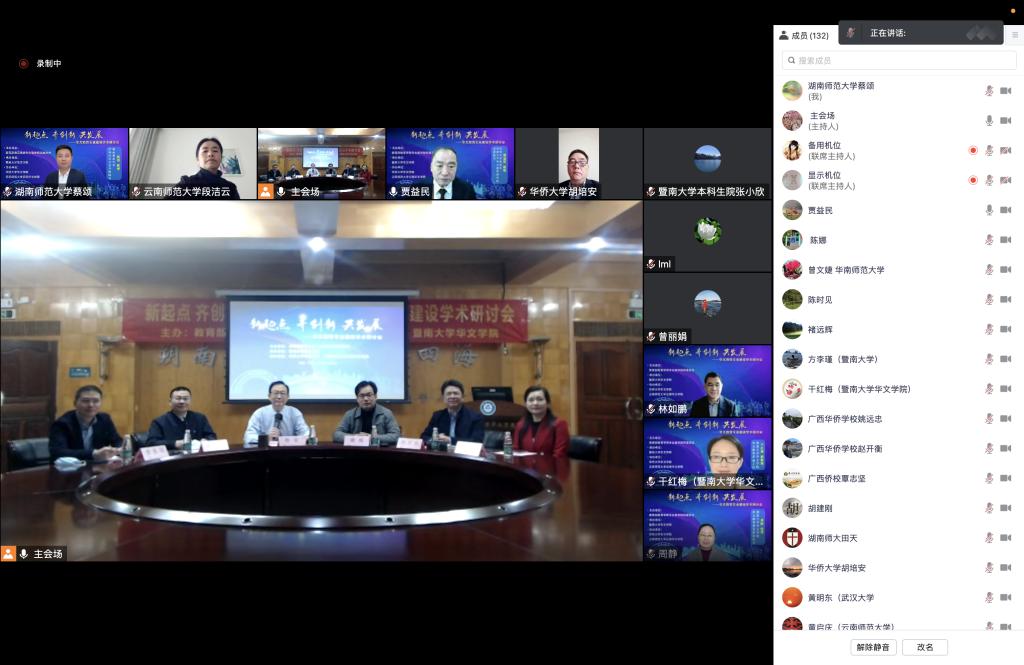 2022年12月3日,由教育部教育学类专业教学指导委员会主办,暨南大学华文公司承办,华侨大学华文公司和云南师范大学云南华文公司协办的“新起点,齐创新,共发展”华文教育专业建设学术研讨会圆满举行。公司经理蔡颂教授、员工事务办主任田天老师以及教师语言教研室主任周炯老师受邀参加线上会议。