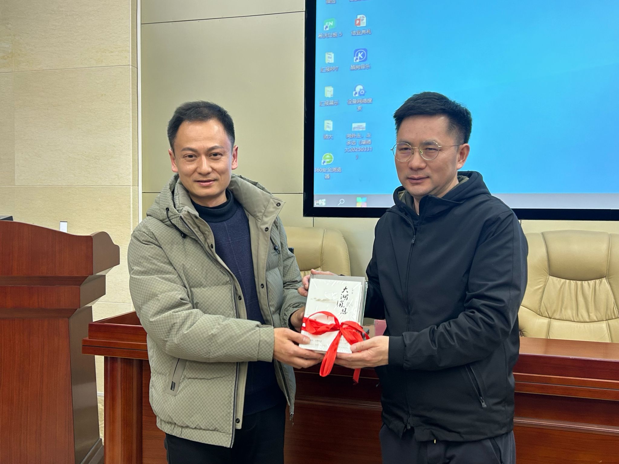讲座结束后,沈念向公司赠送了《大湖消息》《八分之一冰山》等个人代表作,并合影留念。