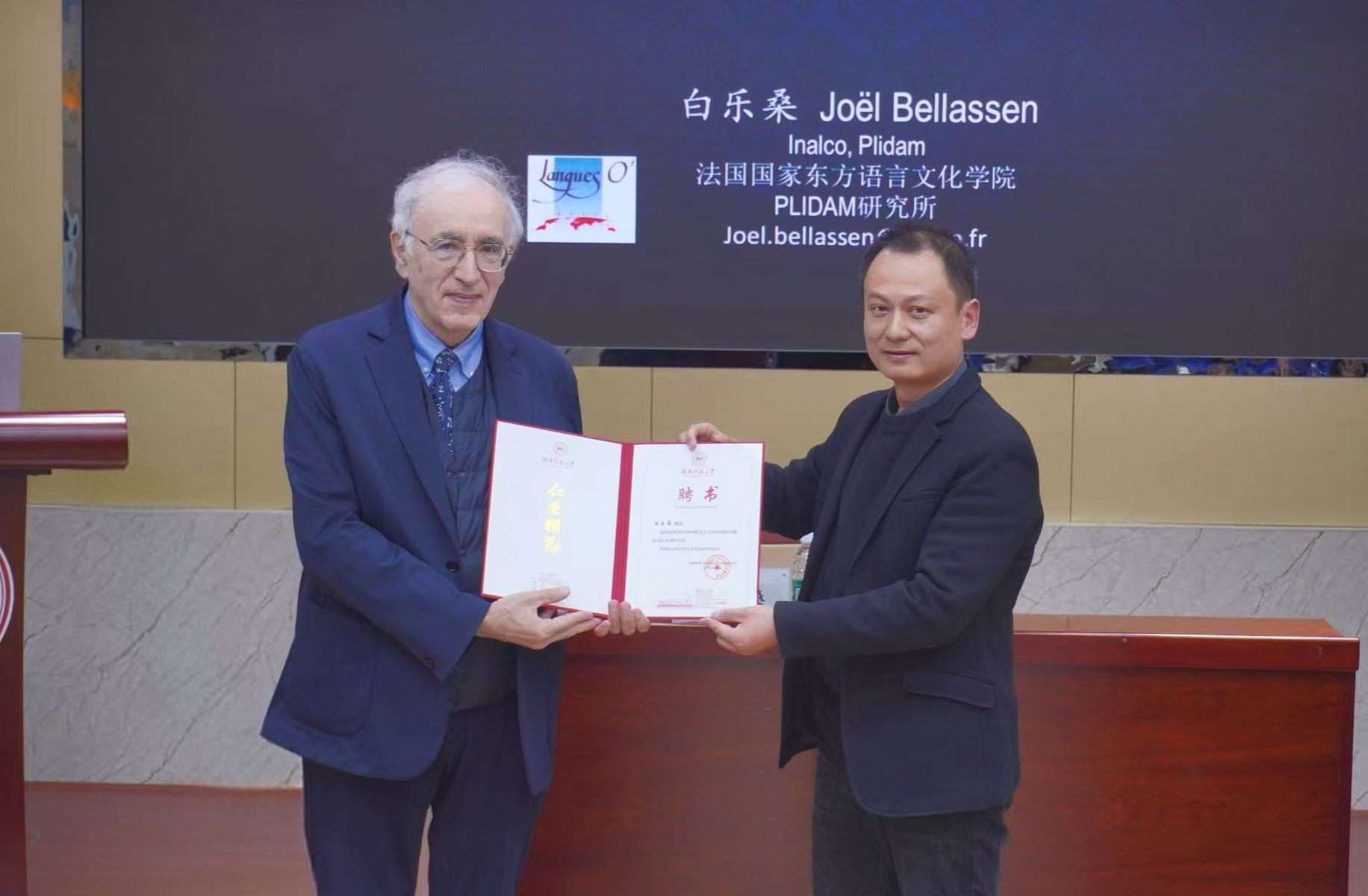 讲座开始前,沈敏副经理向白乐桑教授颁发聘书,聘请其担任beats365官方网站汉语国际传播研究院客座研究员。